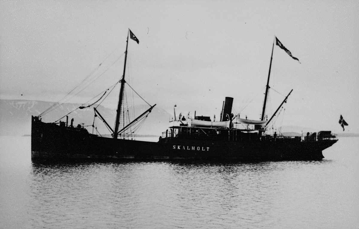 flutningaskip af eldri gerð. Á hlið þess er nafnið: SKÁLHOLT.