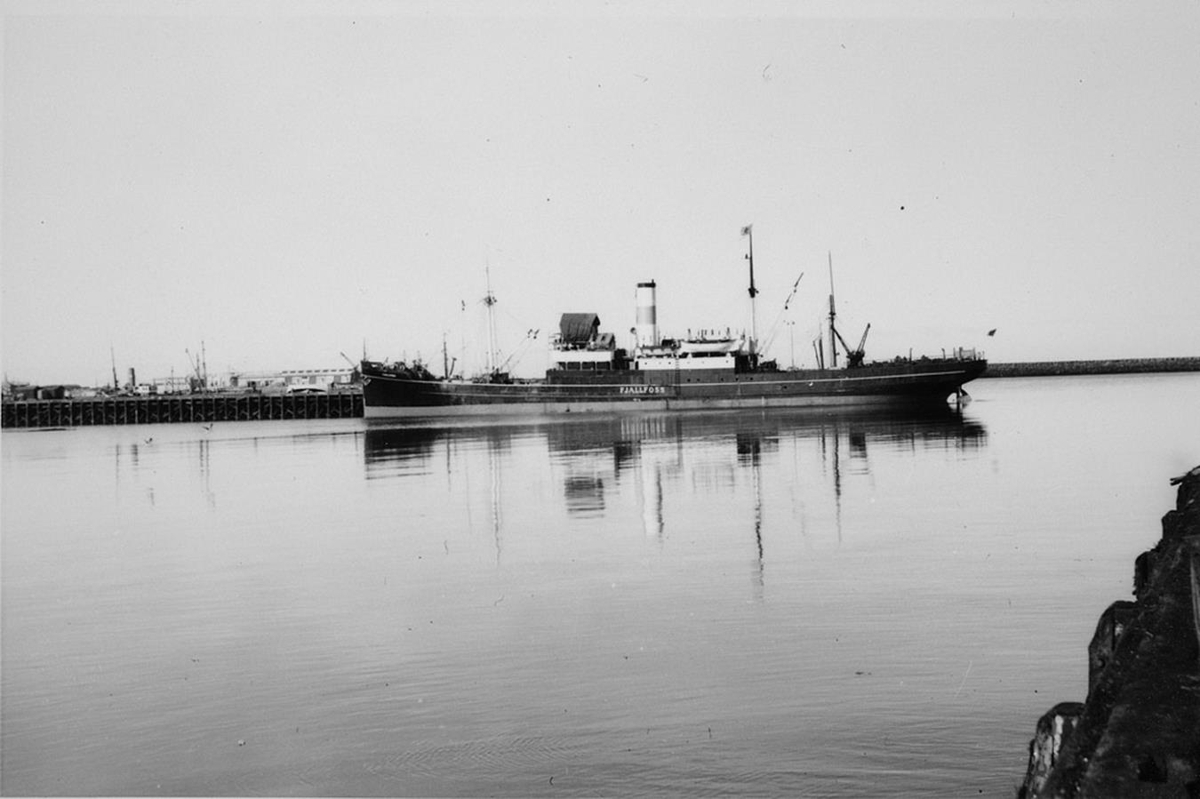 bryggju í baksýn. Á hliðinni er nafnið: FJALLFOSS.