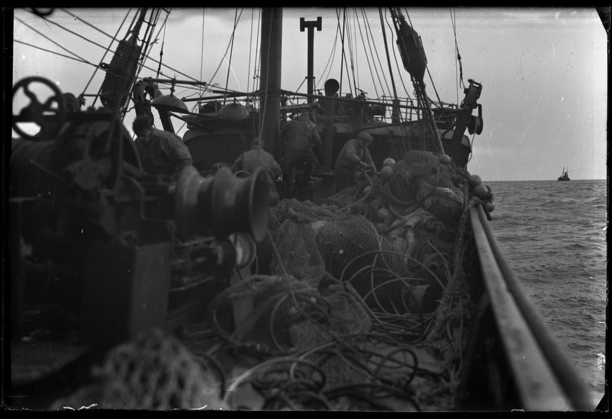 Að sögn er þetta tekið þegar Garðar (GK 25) togaði trollið af Max Pemberton. Verið að greiða úr því hér. Ku hafa verið tekið í stríðsbyrjun.