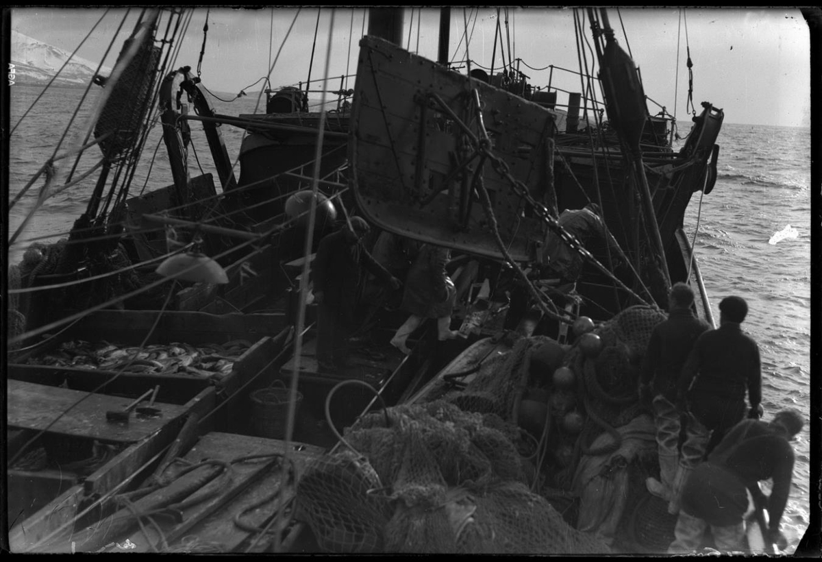 Um borð í togara. Sér fram eftir þilfarinu að hvalbak. Trollið liggur innan við borðstokkinn í bendu að því er virðist. Toghleri undir trollinu og annar á lofti yfir því. Sá þriðji hangir í bakborðsgálga. Mannskapur hjá trollinu. Flestir á peysum og bússum. Hólfað þilfar (kassar) og fiskur í einum. Vinnuljós (sólir), tágakarfa, baujur í vöntum. Í bakgrunni sjór.