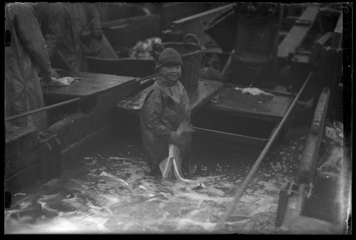 Lítill drengur á sjóstakk, með skinnhúfu og í ullarvettlingum. Heldur um sporð á þorski sem búið er að taka innan úr. Tekið um borð í fiskiskipi (togara) og sjást stíur og fiskikarfa í baksýn. Sjóklæddir menn við vinnu, flatningu vinstra megin (sér á).