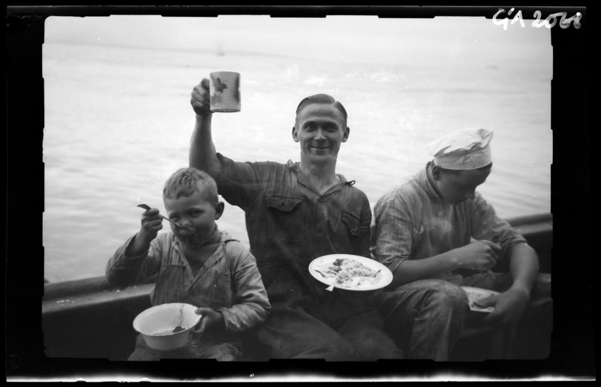 Drengur og tveir menn stija hlið við hlið um borð í togara, við borðstokkinn. Allir að borða. Drengurinn er klæddur samfestingi, peysu undir og heldur á vaskafati og stingur skeið í munn sér. Maður í miðju, klæddur samfestingi, heldur kaffikrús á lofti í höfuðhæð, en matardiski í kjöltu sér. Við hlið hans ungur maður með kokkshúfu, álútur, með vaskafat milli hnjánna.