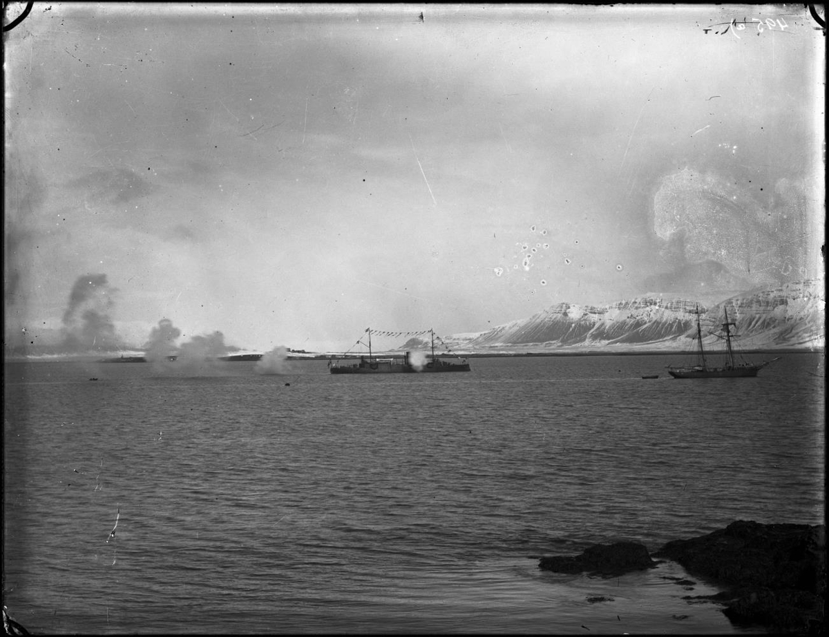 a) Varðskip skýtur heiðursskotum á höfninni. T.h. er frönsk skúta merkt B17, en t.v. árabátur á siglingu. Í baksýn bæjarhús og fjöll. b) Sama og a).