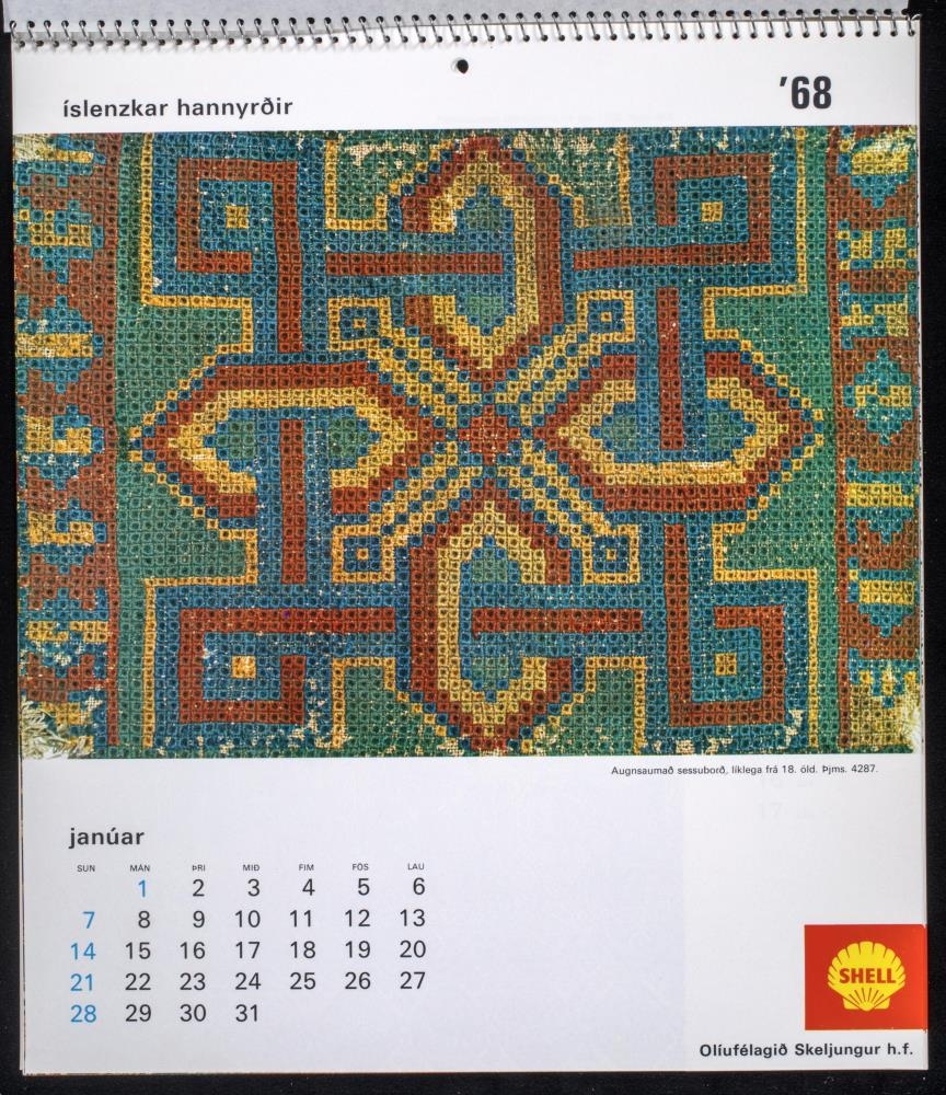 blaði fyrir hvern mánuð með 12 prentuðum litmyndum af íslenskun útsaumi
