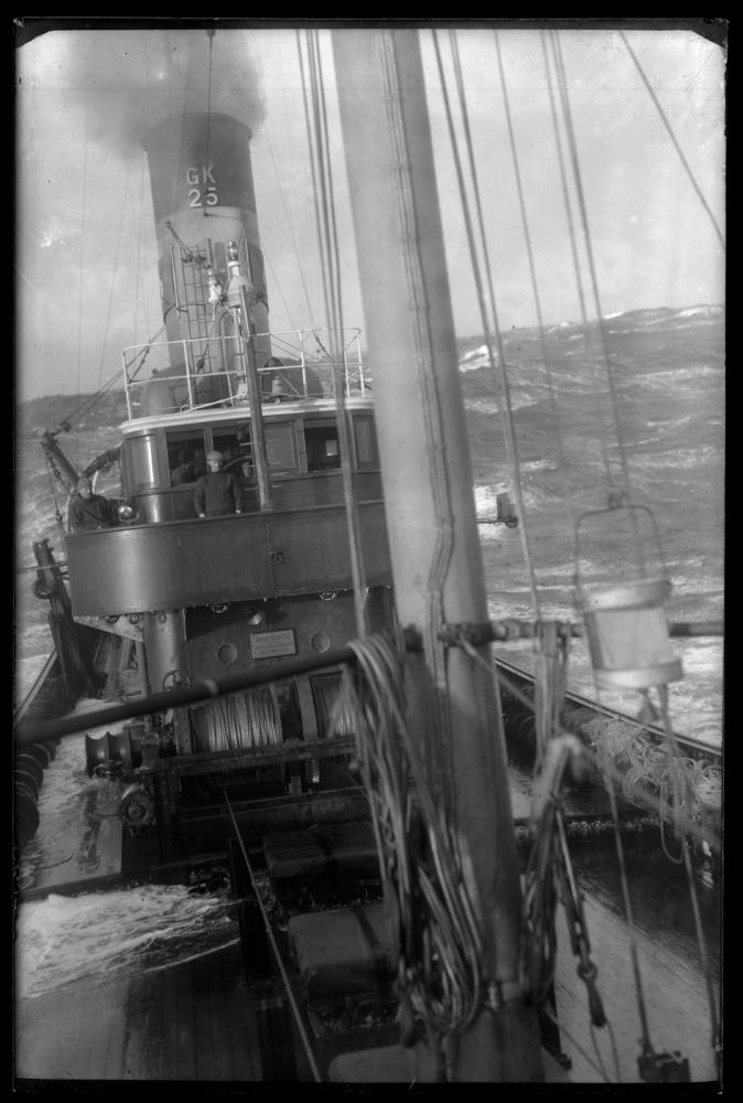 Um borð í togara á siglingu og sér aftur eftir honum: mastur, spil, brú, brúarvæng. Tveir menn á brúarvæng. Sér á mann (menn) í brúnni. Á strompi stendur GK 25. Sjór í bakgrunni.