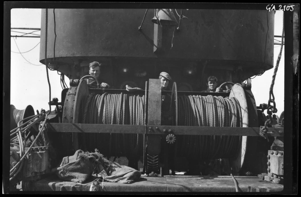 Um borð í togara. Sést spilið og brúarvængur. Þrír menn standa aftan við spilið. Tveir berhöfðaðir. Sá í miðju með derhúfu.