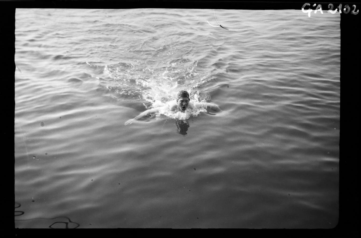 Karlmaður á sundi. Sjást herðar og höfuð. Ber sundhettu.