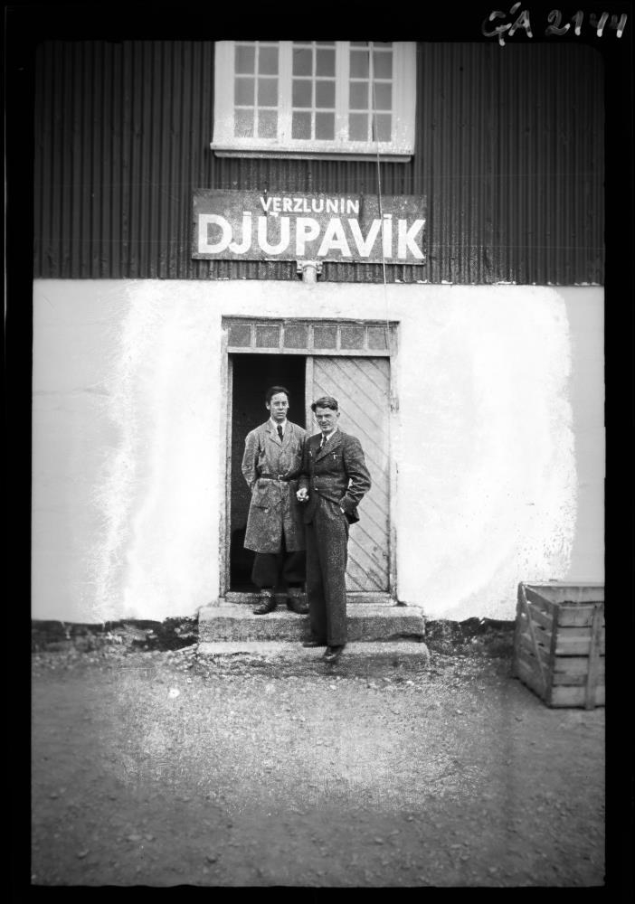 Tveir menn standa framan við útidyr húss sem aðeins sést að litlum hluta. Annar helmingur dyranna opinn. Ofan við dyrnar stendur VERSLUNIN DJÚPAVÍK. Annar maðurinn á jakkafötum, hinn á sloppi.