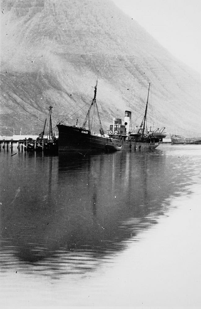 IS449. T.v. sér í bryggju og t.h. annað skip. Brött fjallsbrekka í bakgrunni.