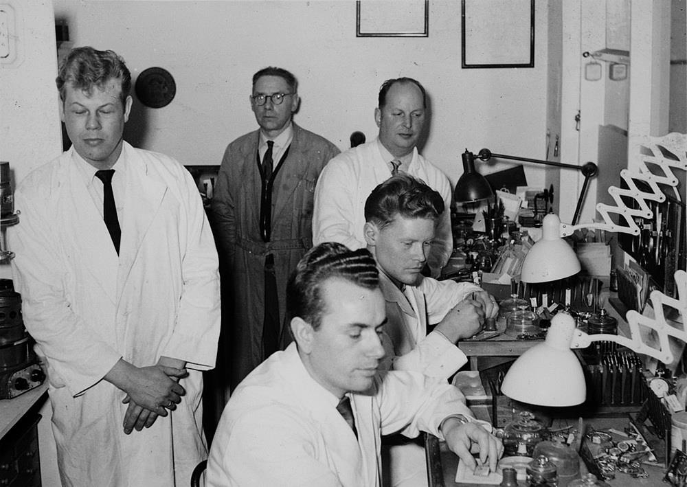 5 menn í sloppum að vinna við úrsmíðar.