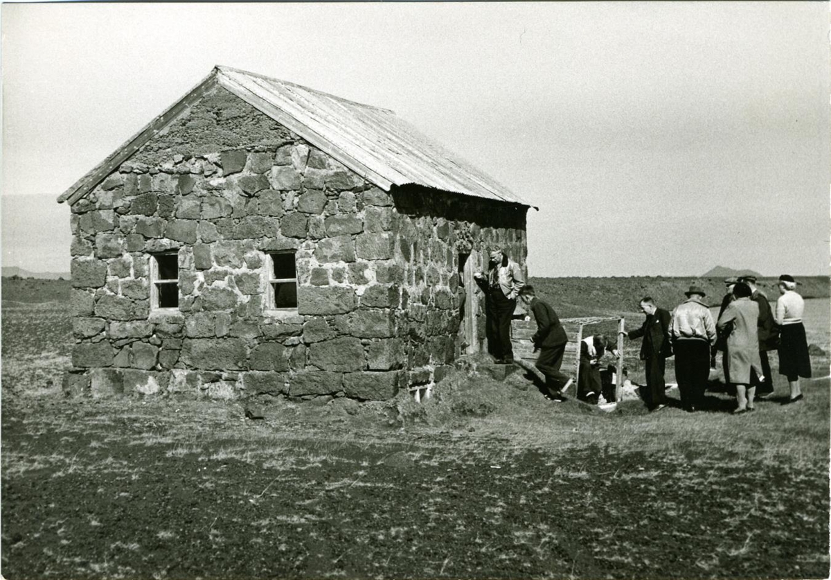 Sæluhúsið við Jökulsá á Fjöllum. Lítið hlaðið steinhús, slétta í kring en fjöll í fjarska. Hópur fólks að skoða húsið, manneskja að koma út um yfirbyggðar kjallaradyr. Á bakhlið er prentað: Með einkarétti: Hannes Pálsson, ljósmyndari, Engihlíð 10, Rvík.