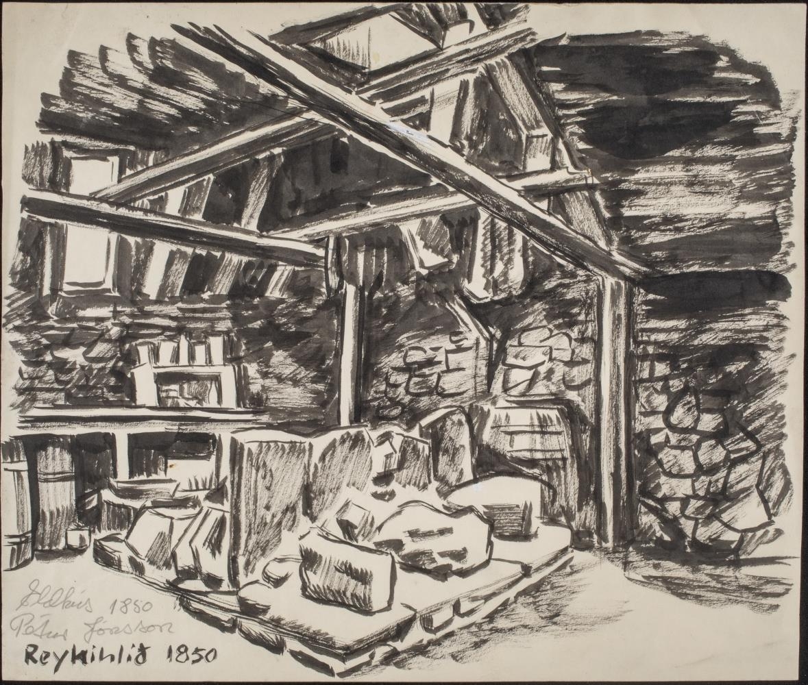 Hlóðaeldhús (í Reykjahlíð?). Í vinstra horni að neðan stendur: Eldhús 1850. Pétur Jónsson Reykihlíð 1850.
