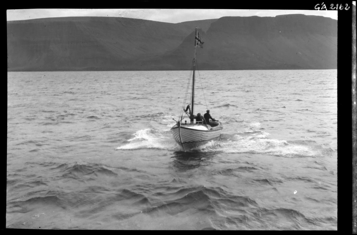 Opinn, síðbyrtur vélbátur með hvalbak og einu mastri á siglingu. Ísl. fáninn blaktir við hún. Tveir menn í bátnum. Fjöll í baksýn.