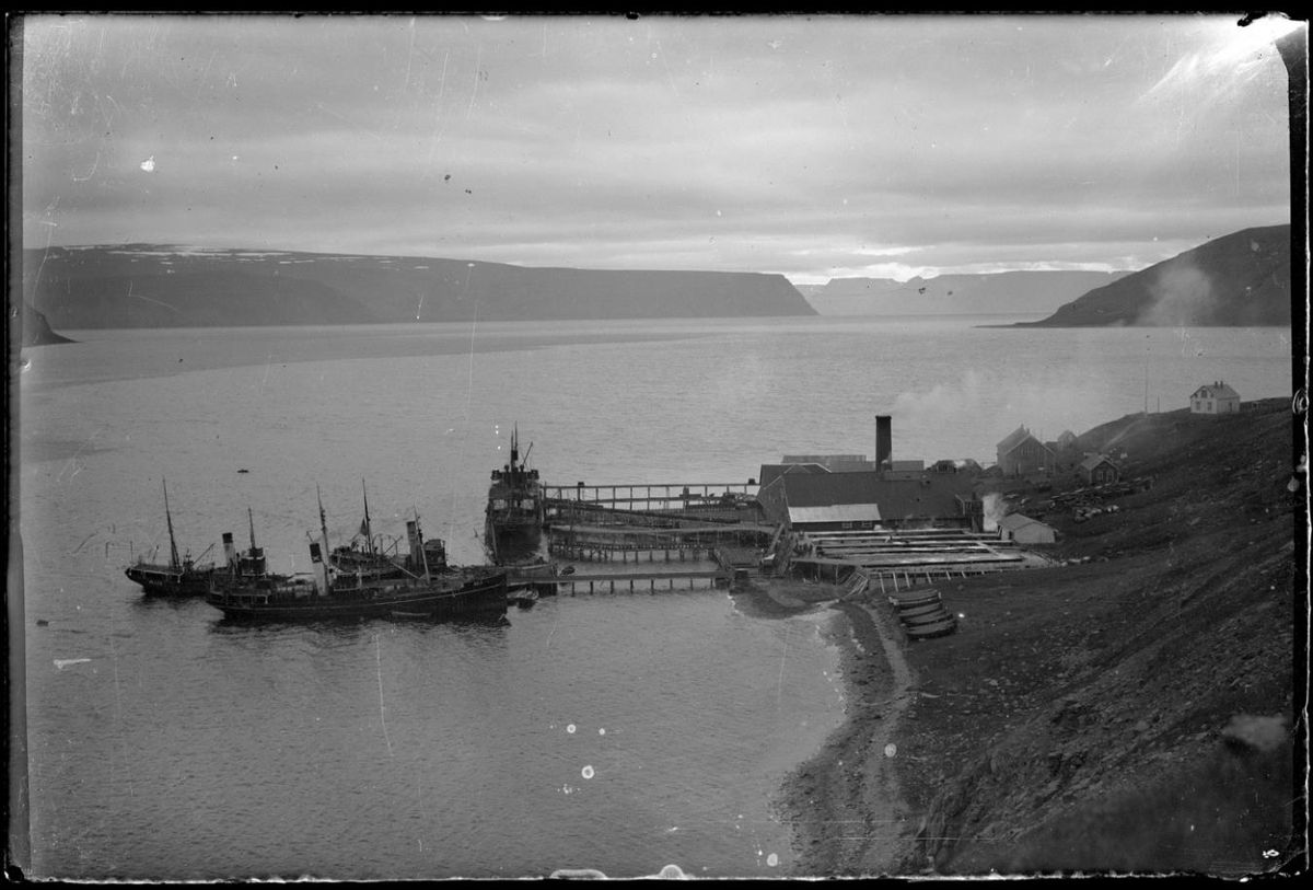Yfirlit yfir síldarvinnslustöð. Veksmiðjuhús, síldarþrær, síldarsöltunarplan, bryggjur. Þrír togarar við bryggju. Bátar dregnir upp í fjöru. Tvö tvílyft hús með risi til hægri. Þrjú minni hús. Í baksýn fjöll og fjarðarmynni.