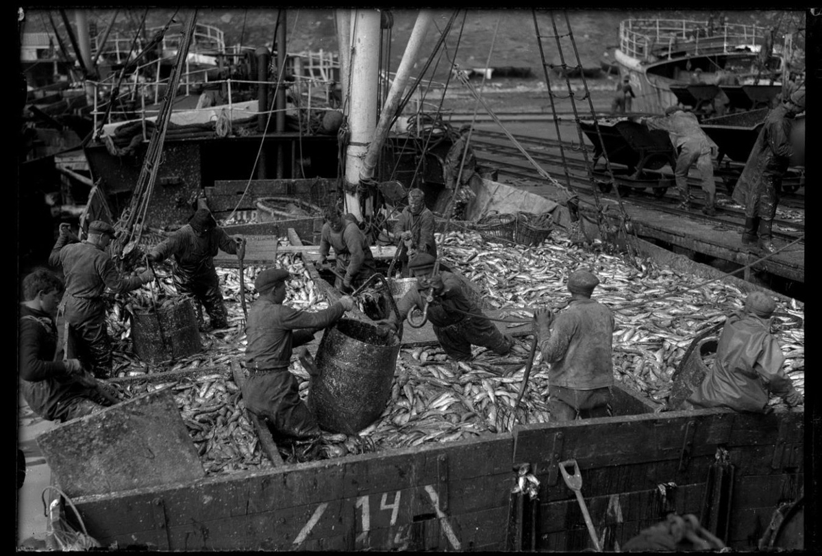 Síldarlöndun úr togara. Sést á fremri hluta hans. Bryggja en upp eftir ganga járnbrautarteinar. Maður á henni ýtir vagni á undan sér. Hinum megin við bryggjuna sér á annan togara, framantil, og ber hann skráningarnúmerið "...134". Mannskapur að störfum í togara í forgrunni, á skyrtum eða búllum og sennilega olíubuxum. Einn á peysu. Síldarmál sem mokað er í. Bakgrunnur fjara, bátar á kambi og hlíð.