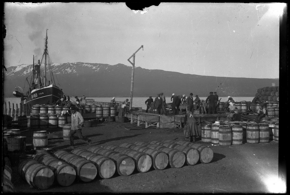 Síldarplan. Síldarsöltun. Menn og konur. Raðir og staflar af tunnum. Síldarborð, kör, handvagn. Staur fyrir miðju. Menn á jakkafötum. Skip (togari) við bryggju: Víðir GK 4250. Fjörður og fjall í baksýn.