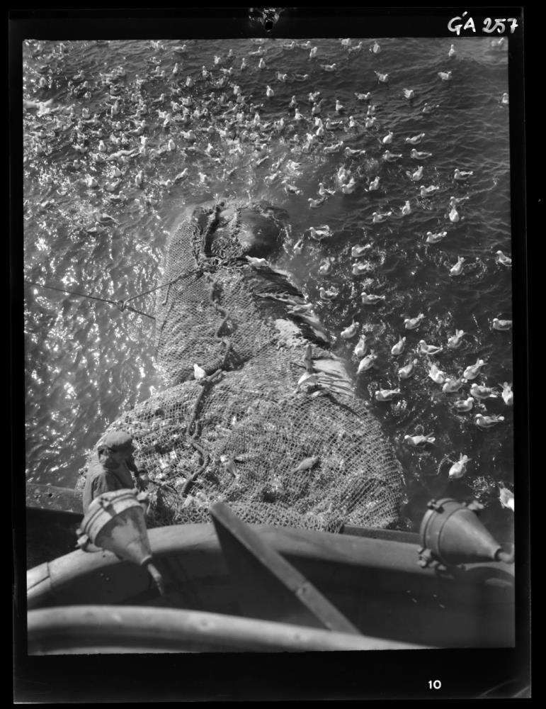 Í forgrunni brúarvængur og kastari. Þar neðan við borðstokkur, bobbingur og sjóklæddur maður. Troll fullt af fiski við skipshlið. Fuglager á sjónum.