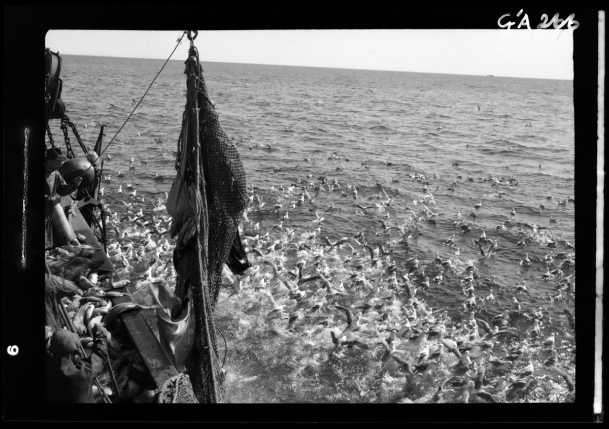 Um borð í togara að veiðum. Sést aðeins hluti af borðstokk stjórnborðsmegin. Fiskur á dekki og sjóklæddir menn, sem sjást að hluta, þar af einn með hatt sem heldur í línu frá trolli sem verið er að hífa. Fuglager á sjónum. Auður sjór í bakgrunni, nema hvað t.h. sést togari í miklum fjarska.