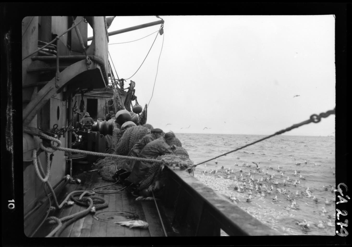 Um borð í togara. Sést stjórnborðshliðin, hluti af keis, brúarvæng og fram eftir þilfari að hvalbak. Sjóklæddir menn - tveir - að ýta á trollið sem er að mestu utan við borðstokk. Menn einnig framar á dekkinu. Bóma skagar út yfir borðstokk. T.h. togvír úr aftari gálga.