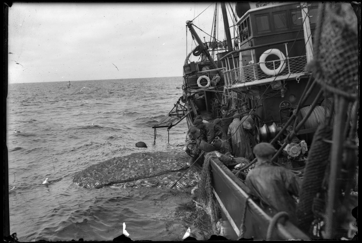 Togari að veiðum. Myndin tekin um borð og sér aftur eftir skipinu frá vanti að brú og keis, einkum stjórnborðsmegin. Belgurinn með afla í flýtur við skipshlið. Toghleri í afturgálga. Sjóklæddir menn á dekki. Rekkverk á brúarvæng með ljósum björgunarhring. Annar á keis. Tveir menn stinga höfði út um brúarglugga. Fiskur hangir aftur á keis. Auður sjór og himinn í bakgrunni.