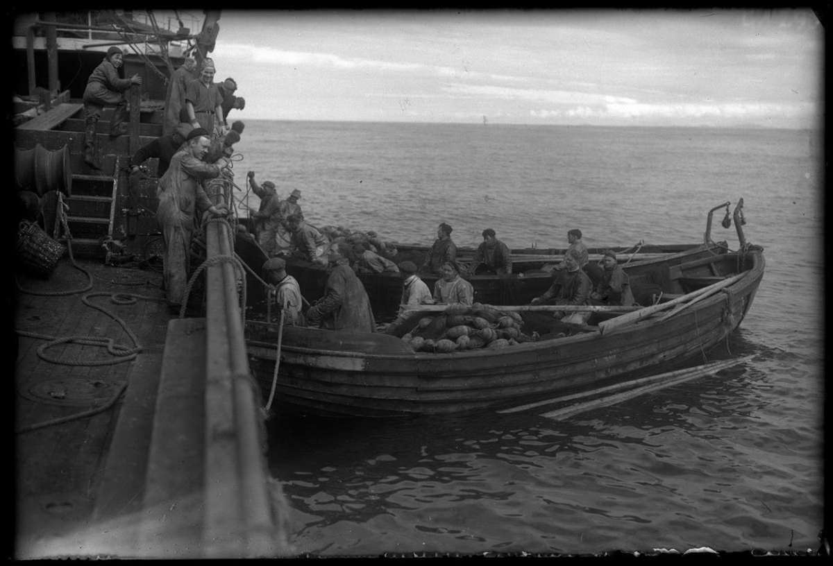 Hér er búið að háfa og verið að ganga frá nót í bátum. Talið vera tekið 1937-1938.