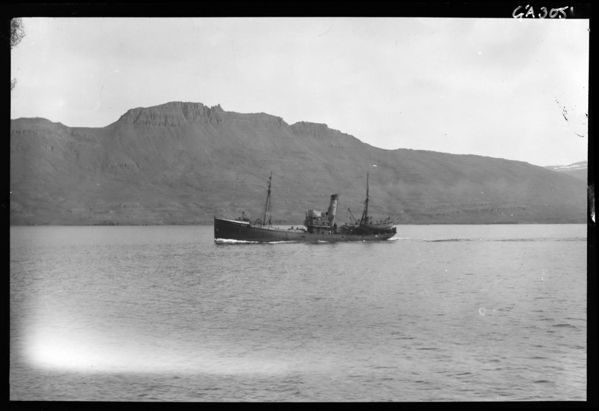 Skipið er á siglingu út Reykjafjörð (fjallið er að sunnanverðu í firðinum) á leið frá Djúpuvík.