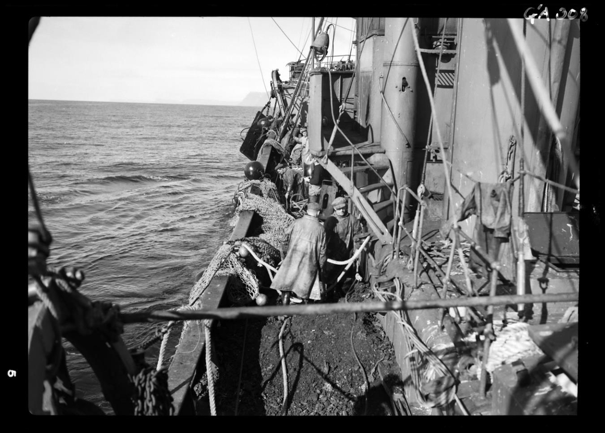 Um borð í togara að veiðum. Sér fram eftir skipinu bakborðsmegin: Keis, brú, brúarvængur, sjóklæddir menn á dekki, troll á borðstokk, toghleri. Dökkleit hrúga aftast á þilfari. Sjór og fjöll í bakgrunni, en óljós þó.