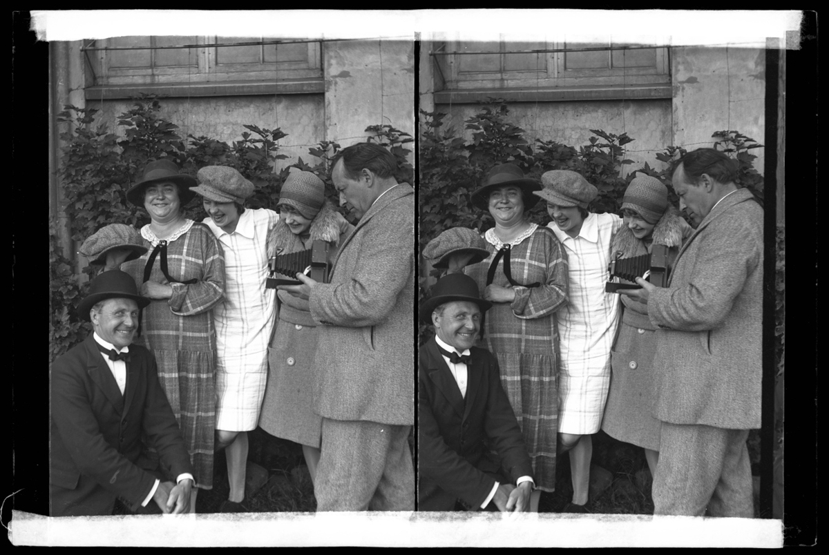 Hópur fólks. Einar Jónsson myndhöggvari með myndavél t.h. Kona hans Anna Marie Jónsson heldur á hatti.