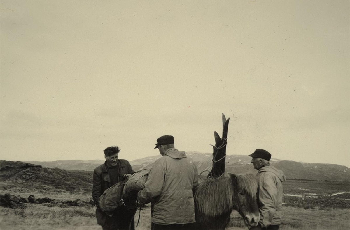 Þrír ferðamenn vinna við að setja trúss á hest. Skíði eru annarsvegar á trússinu.