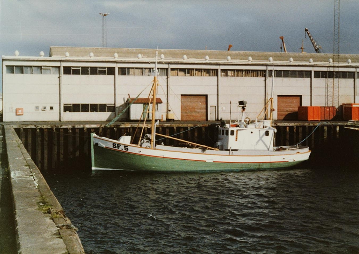 liggur við hafnarbakka. Á kinnung eru stafirnir: SF 5. Stór einnar hæðar