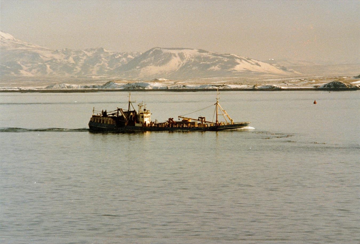 á sléttum sjó. Í baksýn er strönd og fjöll með snjóhulu.
