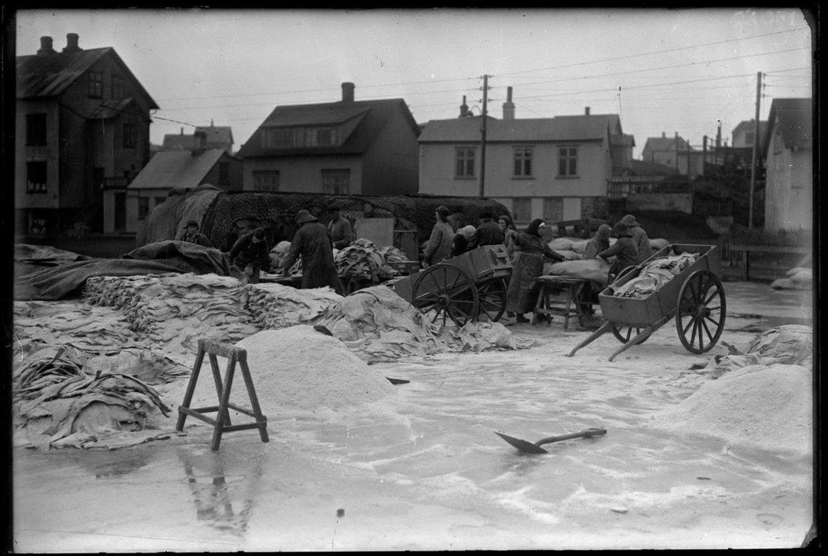 Fólk að vinnu við saltfiskpökkun. Í forgrunni saltbingir, saltfiskstæða sem dregin hefur verið af ábreiðan. Karlmenn á stökkum og með sjóhatta, en sumir á jökkum, konur með skuplur. Ein að sauma utan um saltfisk. Borð, búkki, handvagn, yfirbreidd saltfiskstæða (á bak við fólkið). Hús í bakgrunni.