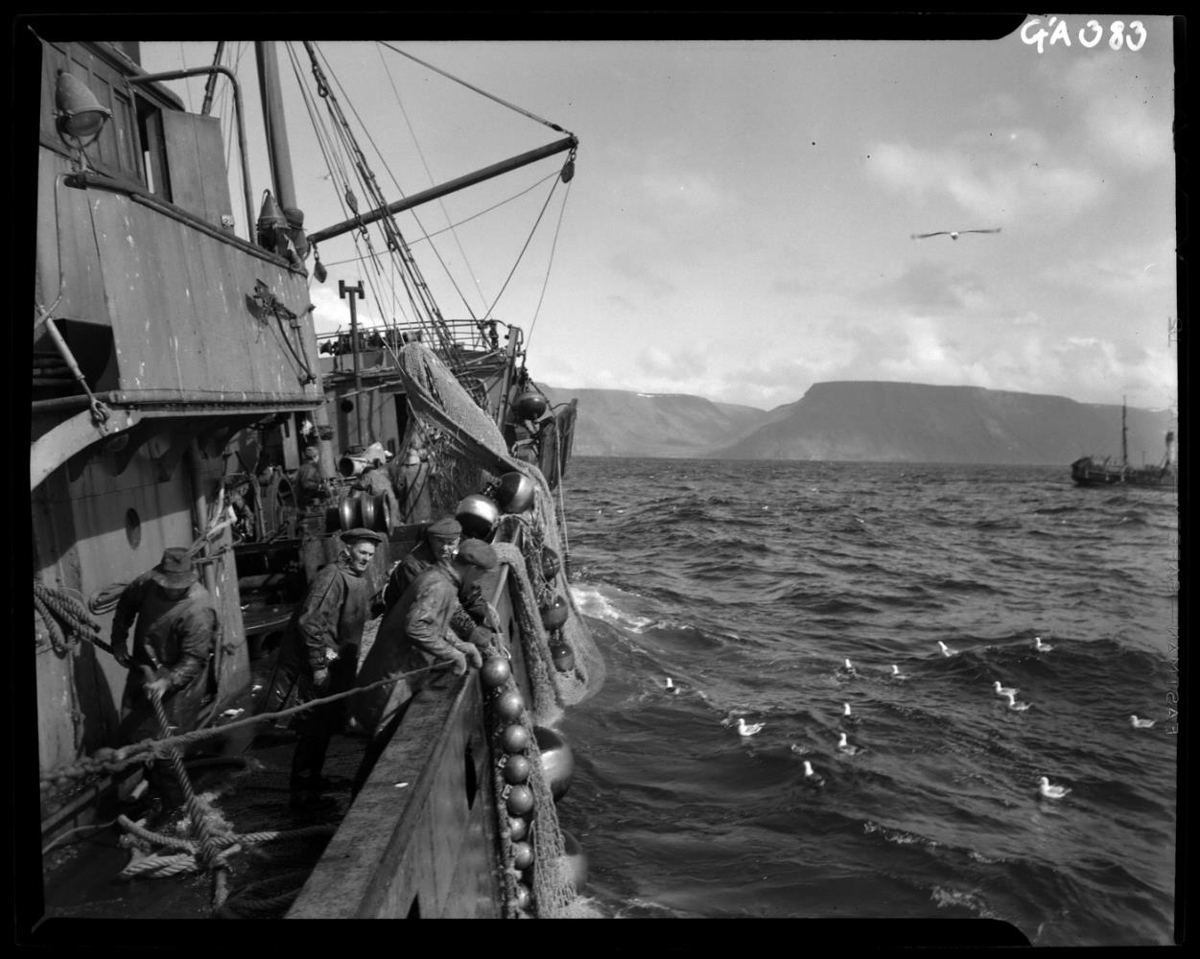 Togari að veiðum. Tekið um borð og sér fram eftir honum stjórnborðsmegin. Maður með hatt á brúarvæng og að nokkru á bak við ljóskastara. Sjóklæddir menn á dekki, flestir með derhúfur, einn með hatt. Verið að hífa trollið um borð. Fjöll í bakgrunni. Lengst t.h. sér á skut annars togara.