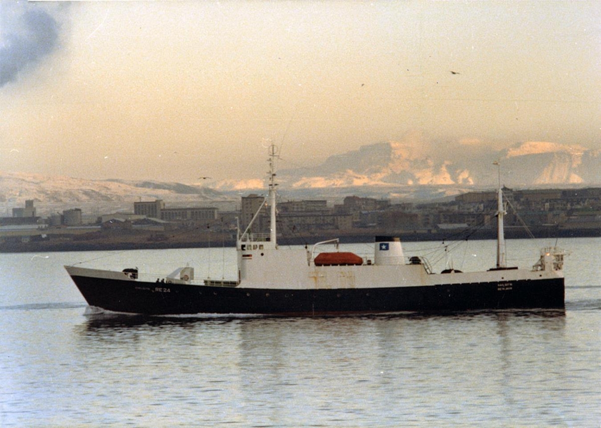 er á siglingu skammt undan landi í baksýn, þar er þétt byggð og fjöll í