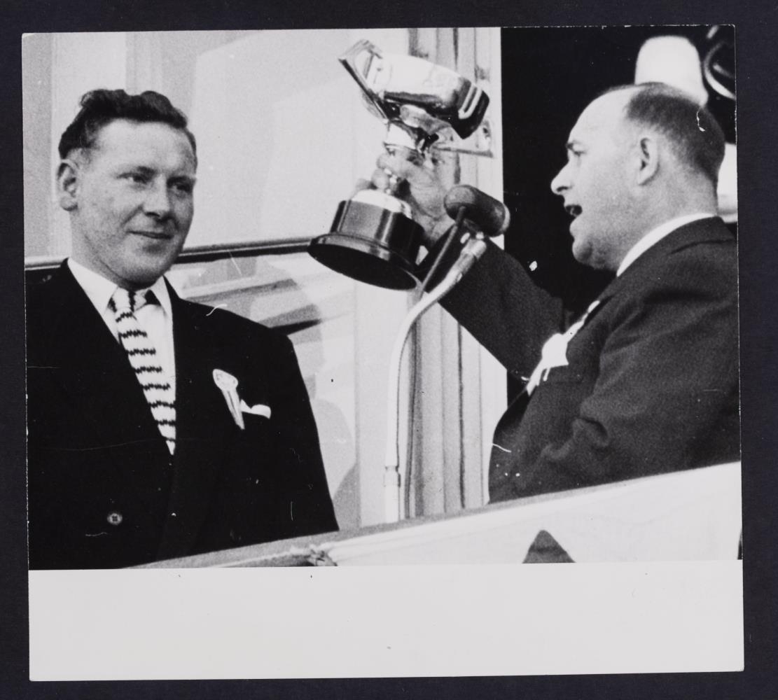 á lofti verðlaunabikar. Yfirskrift greinarinnar með myndinni er: Sjómannadagurinn: