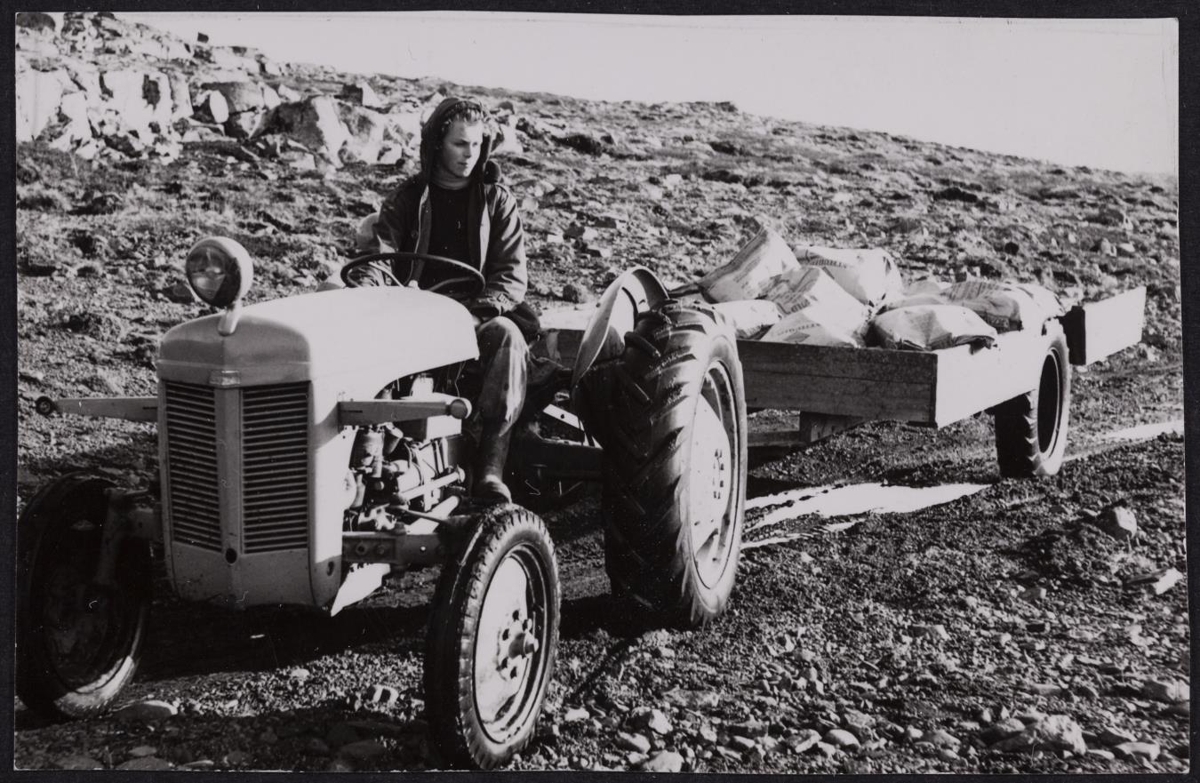 Ungur maður situr á dráttarvél og hefur vagn í eftirdragi. Á vagninum eru pokar. Yfirskrift greinarinnar með myndinni er: Bóndi nútímans verður að færa sér tæknina í nyt. Segir hér frá heimsókn blm. að Vígholtsstöðum í Laxárdal. Undir myndinni stendur: Sonur þeirra Vígholtsstaðahjóna kemur vagandi eftir akbrautinni á Ferguson dráttarvélinni. Aftan í er dráttarvagn hlaðinn tilbúnum áburði. Drengurinn heitir Sigurbjörn [Sigurðsson].