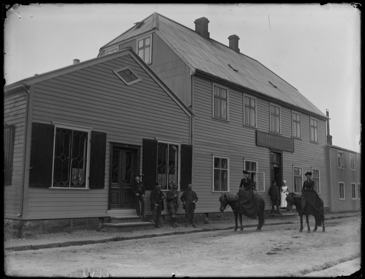 Tvær konur á hestum frman við stórt hús með skilti yfir dyrum með áletruninni: Hótel Ísland. Fjórir karlar upp við vegg að fylgjast með. Annar frá vinstri er Coghill sauðakaupmaður.