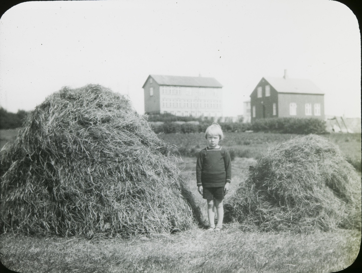 91. Reykjavík. Vatnsmýrin. Drengur á milli tveggja misstórra heysátna. Tvö timburhús í baksýn. Annað er Kennarskólinn við Laufásveg en hitt kann að tengjast Gróðrastöðinni. Drengurinn er Eirík Eylands. Fóðurræktartilraunir á vegum Metúsalems Stefánssonar í Gróðarstöðinni á þriðja ártugnum.