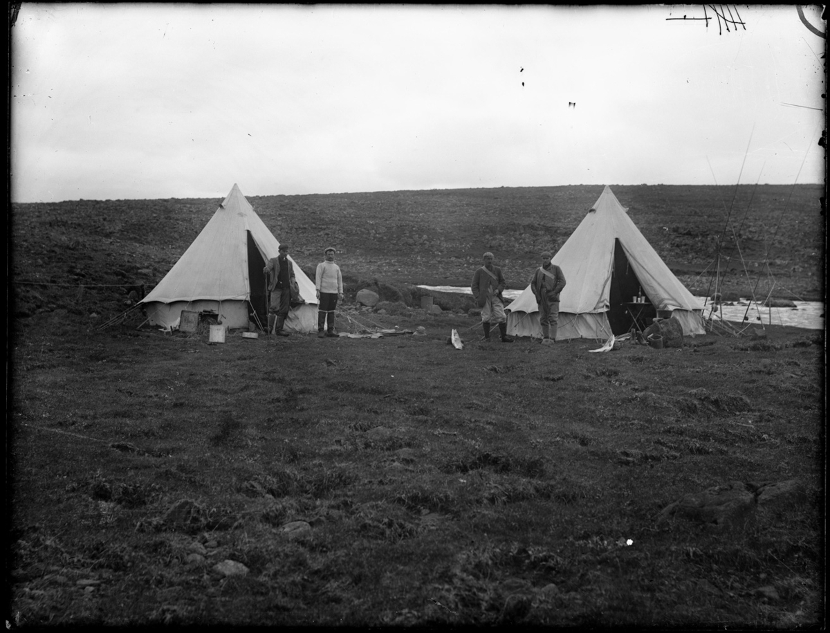 Fjórir menn standa við tvö tjöld, þrír erlendir laxveiðimenn.Veiðistangir standa þar hjá og lax liggur við tjald. Þekkja má Ólaf Hauk Benediktsson bónda á Elliðavatni lengst t.h.