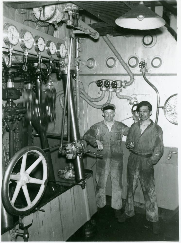 Til vinstri er Eyjólfur Einarsson, 1. vélstjóri. Hinn maðurinn er Jón Albertsson, kyndari. Í eldri skrá segir að þetta sé úr vélarrúminu á b/v Venusi, en því mótmæla heimildarmenn.