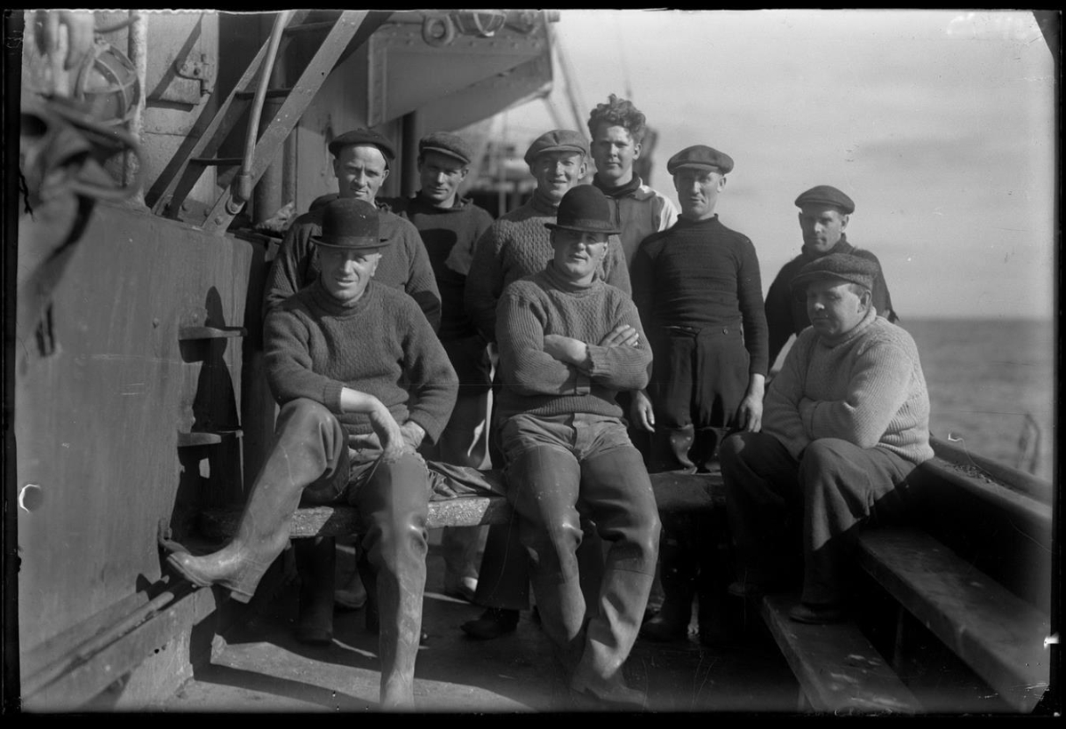 Níu menn í hóp um borð í skipi. Einn situr við borðstokkinn á einsk. tröppum, tveir aðrir á bjálka sem liggur frá þeim á rör á keis, og loks situr einn á borðstokk. Hinir standa. Klæðnaður: Peysur, blússa (búlla), buxur, derhúfur, kúluhattar, skór og bússur. Tekið um borð rétt aftan við brúarvæng og sér fram eftir skipinu, stjórnborðsmegin.