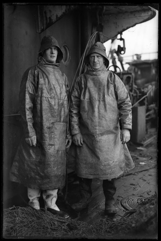 Án efa tekið um borð í togaranum Garðari (GK 25). Hluti af trolli í forgrunni. Tímasetning miðast við áætlaðan aldur mannanna, en af þeim er til fjöldi annarra mynda á Garðari. Tímasetning einnig sbr. GÁ 91.