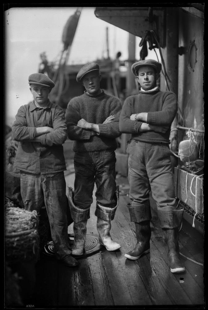 Þrír menn standa samsíða á þilfari togara, á móts við brúarvæng. Einn á nankinsfötum, annar á nankinsbxum og peysu, sá þriðji á lokubuxum og peysu. Allir bera derhúfur. Tveir á bússum. Krossleggja handleggi á brjóstinu. Sér fram eftir skipinu bakborðsmegin.