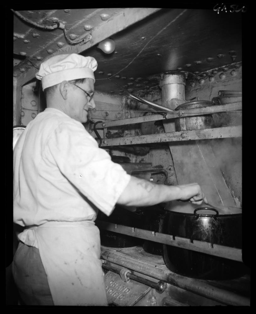 Kokkur að hræra í stórum potti á eldavél. Klæddur hvítri stutterma skyrtu, hvítri svuntu og hvítri kokkshúfu. Ber gleraugu og sést á hlið. Á eldavélinni sér á annan pott og ketil. Á loki eldavélar stendur "GRAND PACIFIC". Hilla með pottum ofan eldavélar. Ljósapera hangir niður úr þaki.