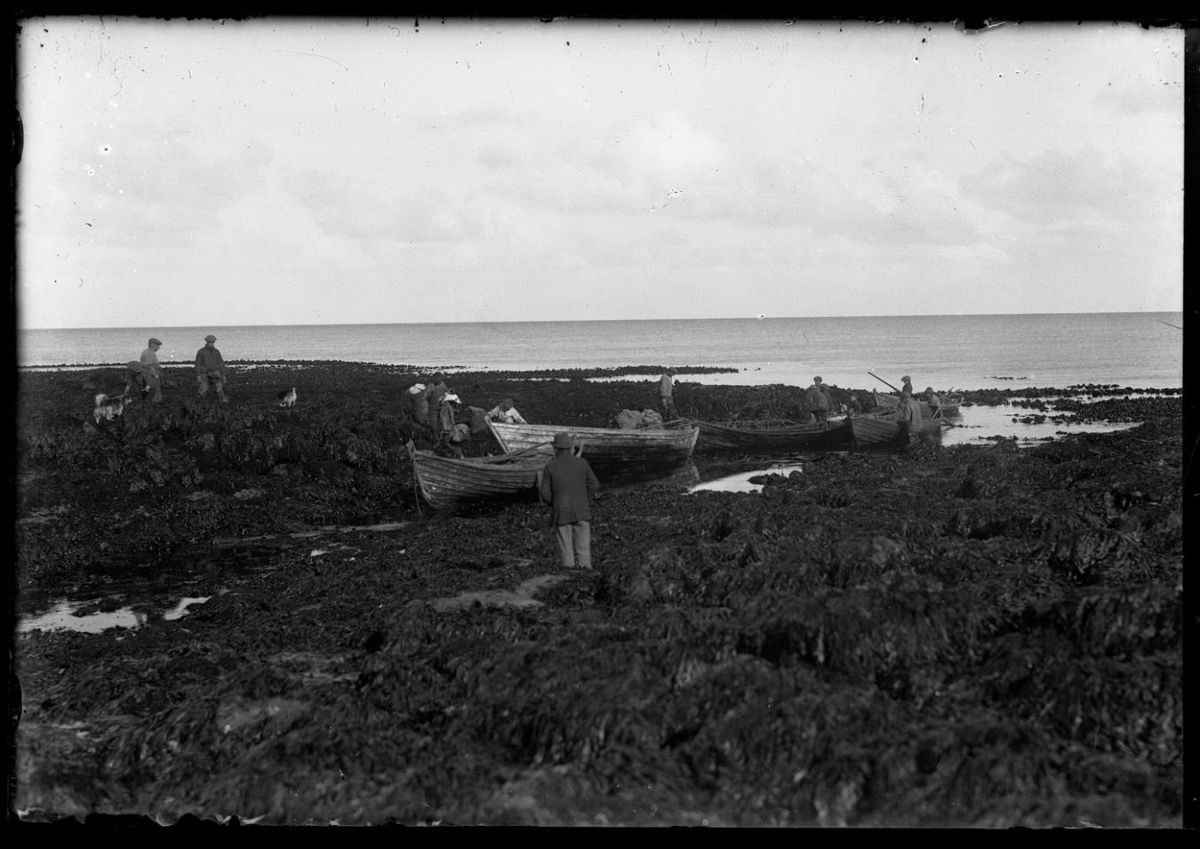 Fjara, vör. Fjórir árabátar í henni. Menn standa við bátana og sumir á vararköpunum. Auður sjór í bakgrunni.