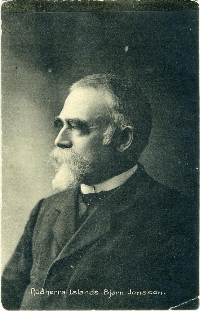 Póstkort með mynd af Birni Jónssyni. Neðst stendur: „Ráðherra Islands Bjørn Jonsson“.