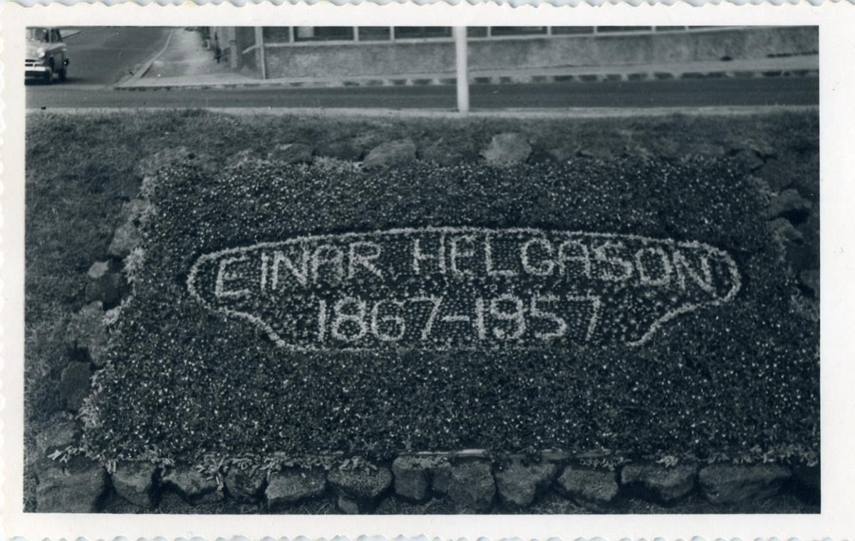 Ljósmynd af blómabeði. Með blómunum hefur verið myndaður texti, þar stendur „EINAR HELGASON 1867-1957“. Grjóti er hlaðið í kringum beðið. Í bakgrunni sést gata, hinum megin við hana hús og bifreið. Á bakhlið handskrifuð jólakveðja: Jólin 1957.