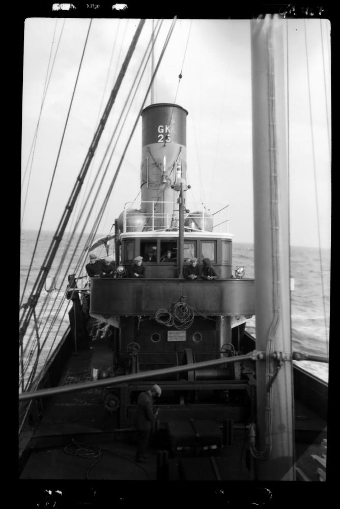 Togari á siglingu og er myndin tekin um borð. Sér aftur eftir honum frá mastri. Maður á jakkafötum á dekki. Nokkrir peysuklæddir menn á brúarvæng, einn á jakka. Í brúargluggum maður og kona. Á strompi stendur GK 25. Engin veiðarfæri.