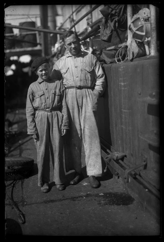um borð í skipi, en bak við þá sést í bátadekkið.