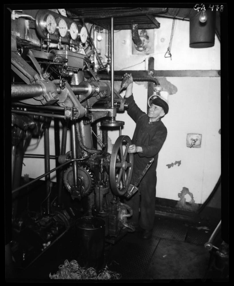 Vélarrúm í skipi. Vél, mælar, hjól, stengur, leiðslur. Maður með kaskeyti og á nankinsjakka og buxum. Heldur á smurkönnu og er að smyrja. Heldur hinni hendinni í hjól. Vélin er í gangi. Gufuketill í bakgrunni.